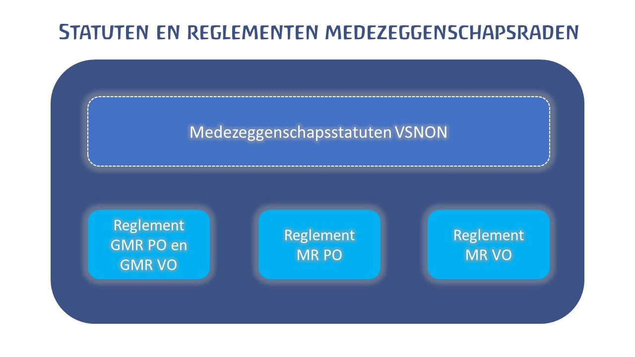 VSNON omvat twee basisscholen en twee vestigingen voor Voortgezet Onderwijs. Iedere school of vestiging heeft een eigen MR voor schoolspecifieke zaken. Bovenschools is er een GMR PO en een GMR VO. De gesprekspartner van de GMR'en is de bestuurder. De MR'en op de scholen spreken met de betreffende schoolleider.